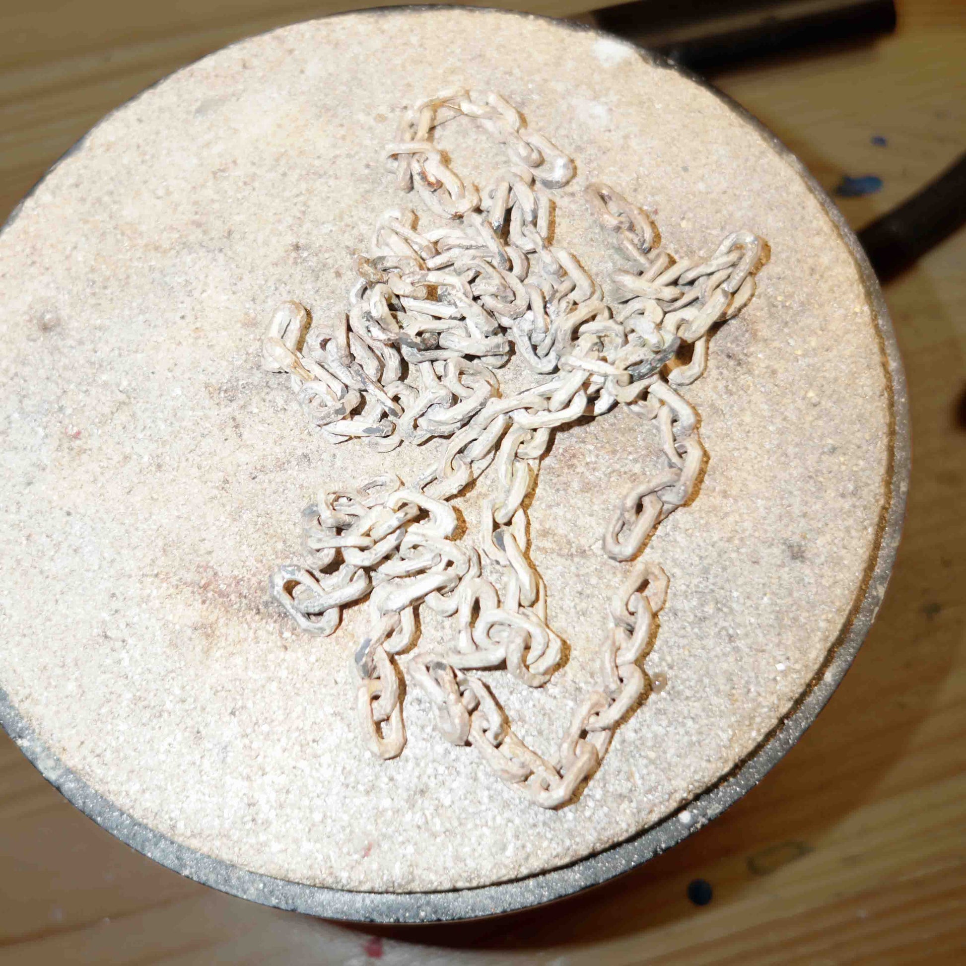 It has a textured surface and carved edges, with a semi-polished finish. Each link is unique and hand-made locally by me, and gets its texture from the mold that has been cast in sand.