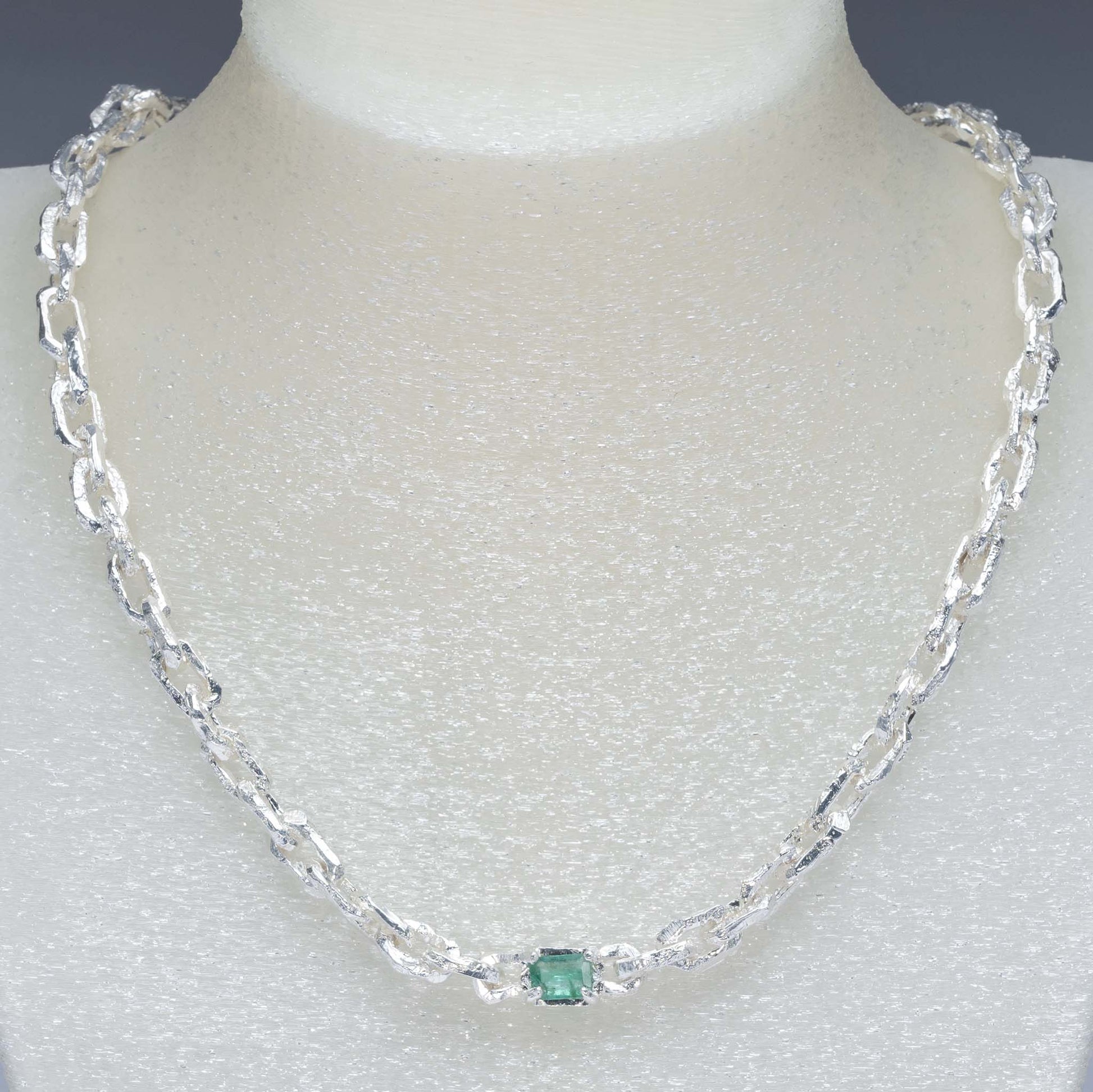 Each link is made from a mould taken from links that were cut and shaped by hand, then cast in sand to create a grainy texture that makes every link unique. The chain has a small engraved logo that is subtly placed. The necklace is finished with a secure toggle clasp in the same design. The necklace can be ordered with other stone combinations. Please contact us for more information.