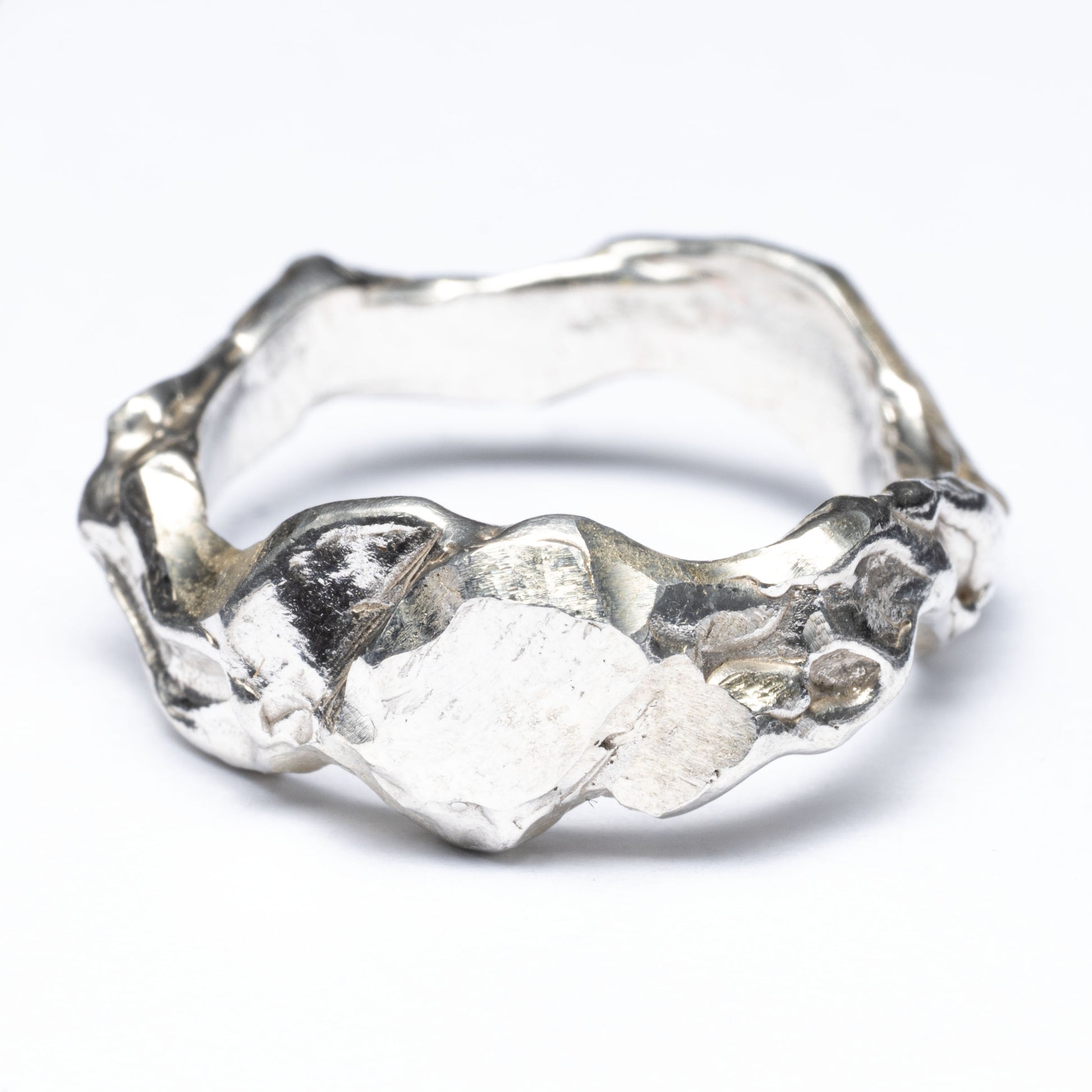 This ring features a fully polished inner band and is hand-carved from a single piece of wax using various tools to create a raw, organic exterior texture. It is polished in select areas, while other parts of the outer surface are finished with a subtle brushed texture for contrast.