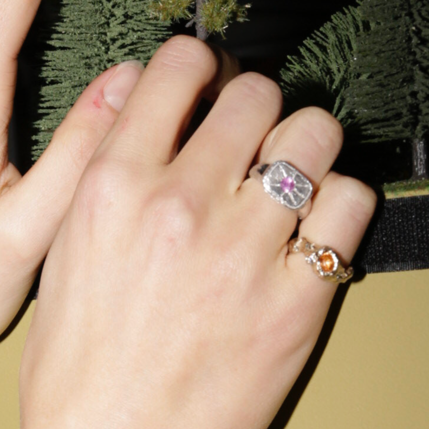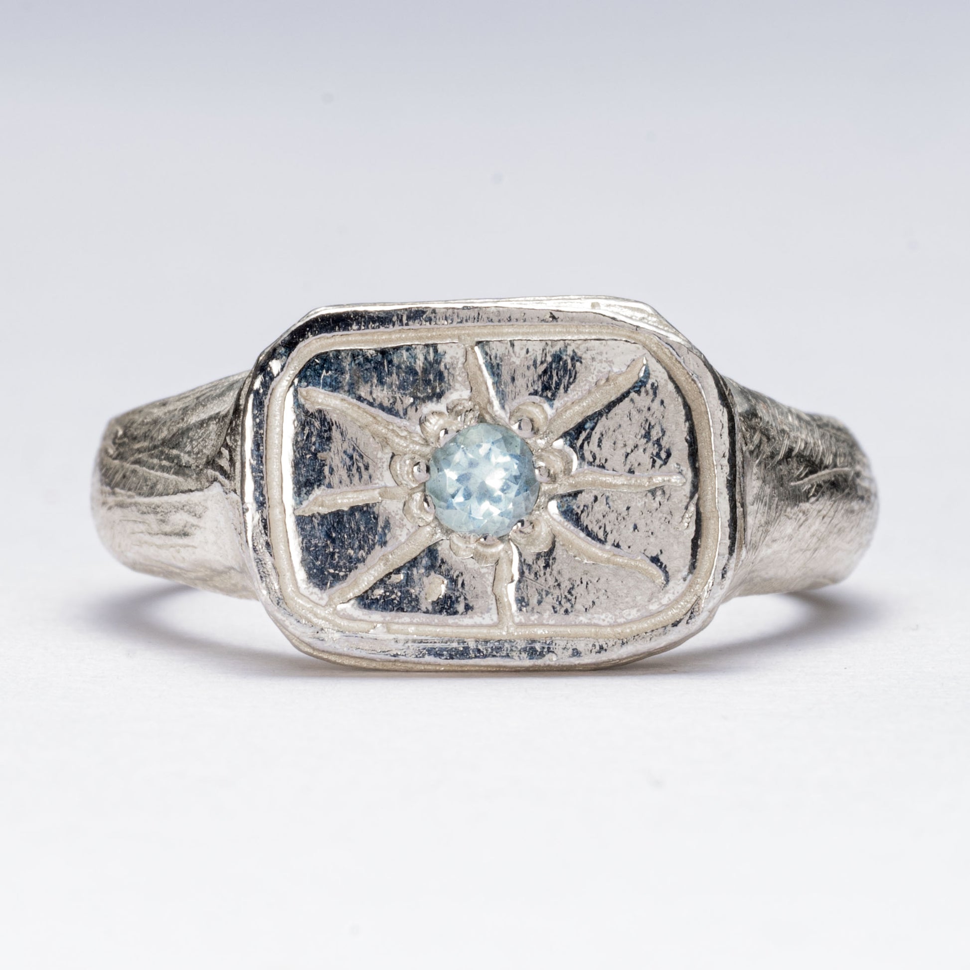 A signet ring featuring a light blue sapphire in the center, available in multiple colors. The stone is secured with a star-shaped engraving and lit from the back to give it depth. The ring has a mixed surface texture: fully polished on the inside, with a matte, brushed, and rugged outer shell and a polished top.