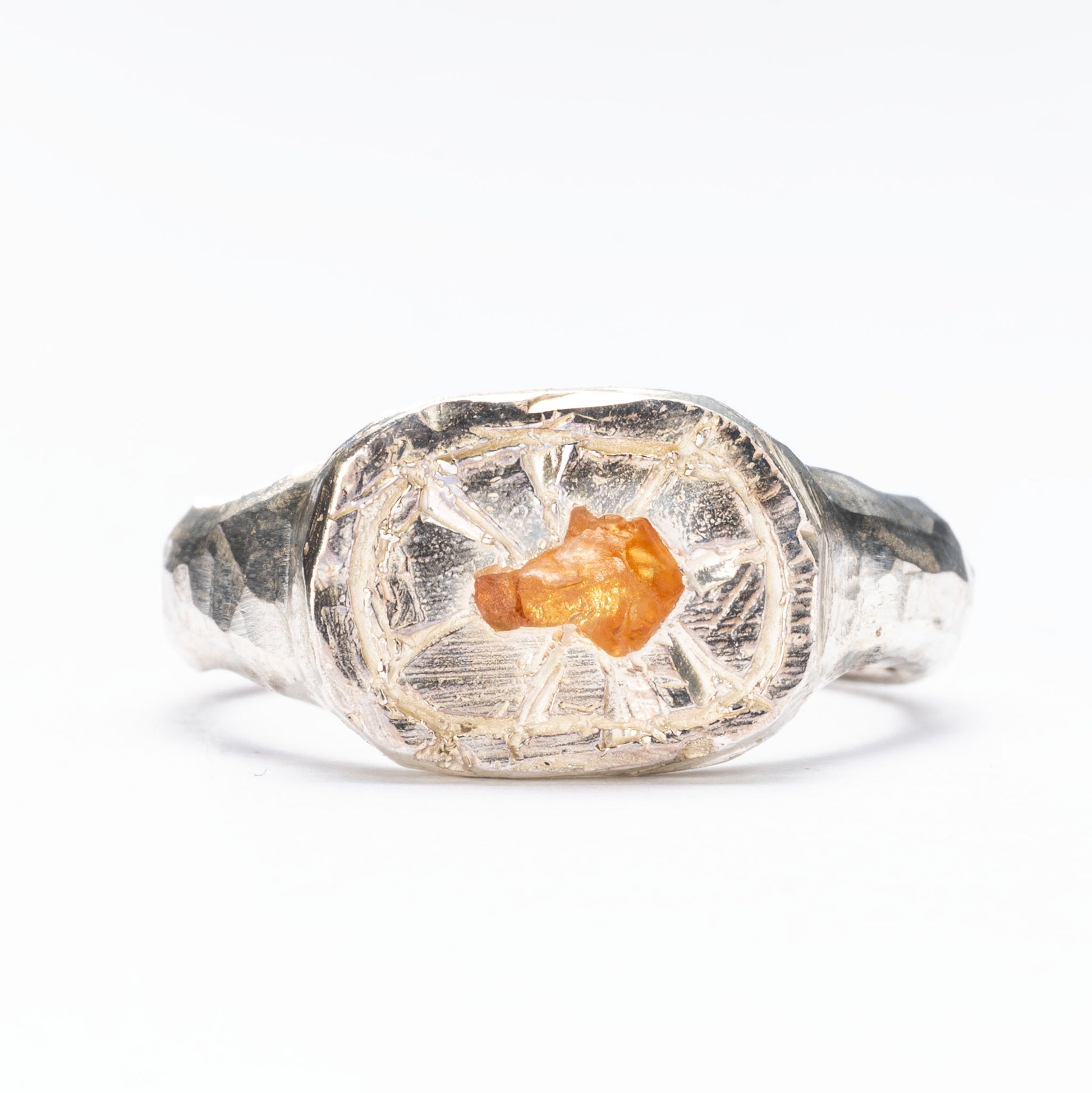 A signet ring featuring a raw natural orange sapphire in the center, available in multiple colors upon request. The stone is cast in place with a star-shaped engraving and lit from the back to give it depth. The ring has a mixed surface texture: fully polished on the inside, with a matte, brushed, and rugged outer shell and a polished top.