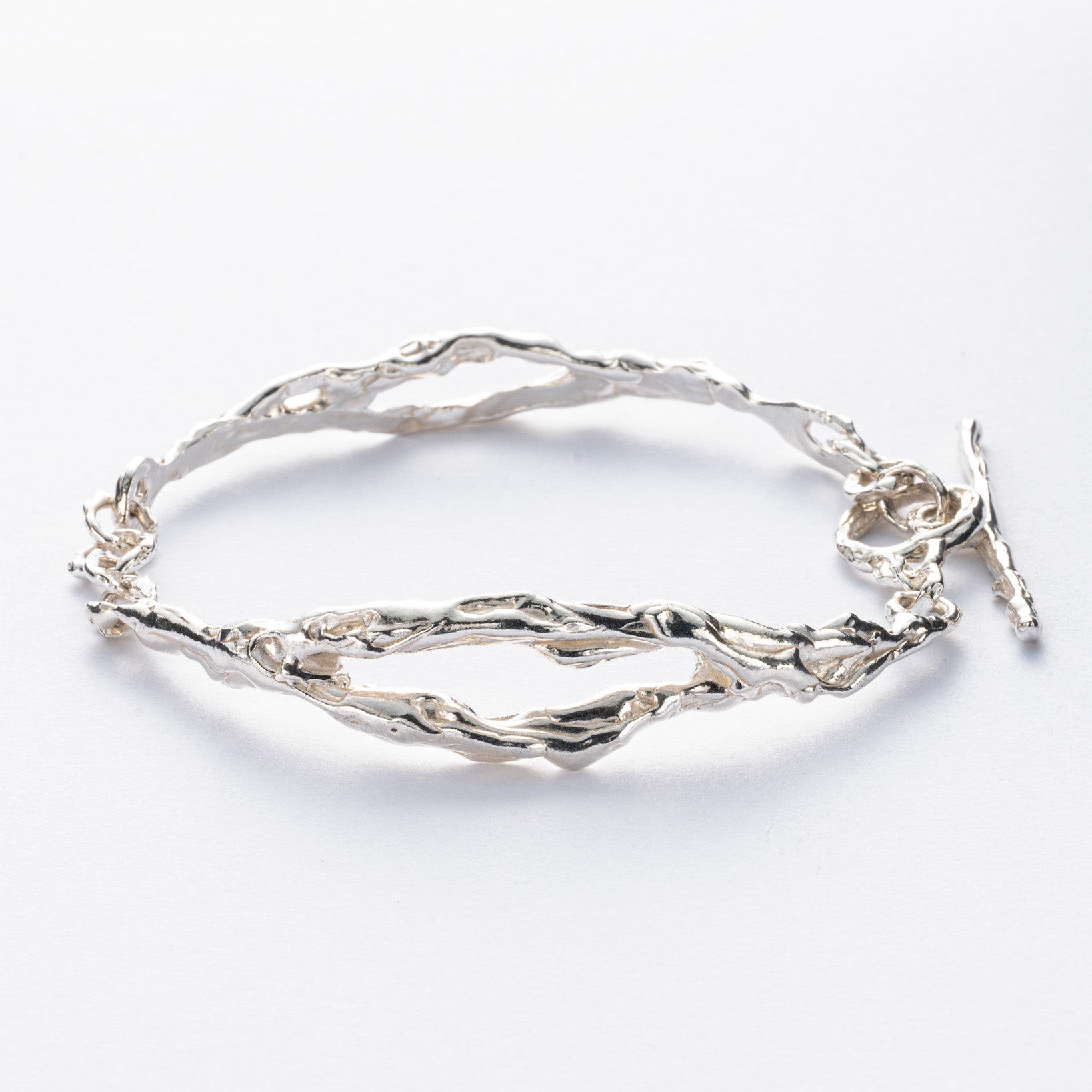 It is handmade by first creating two larger silver pieces shaped with molten wax, combined with smaller round links, giving each bracelet its own unique variation. Every bracelet looks a little bit different.