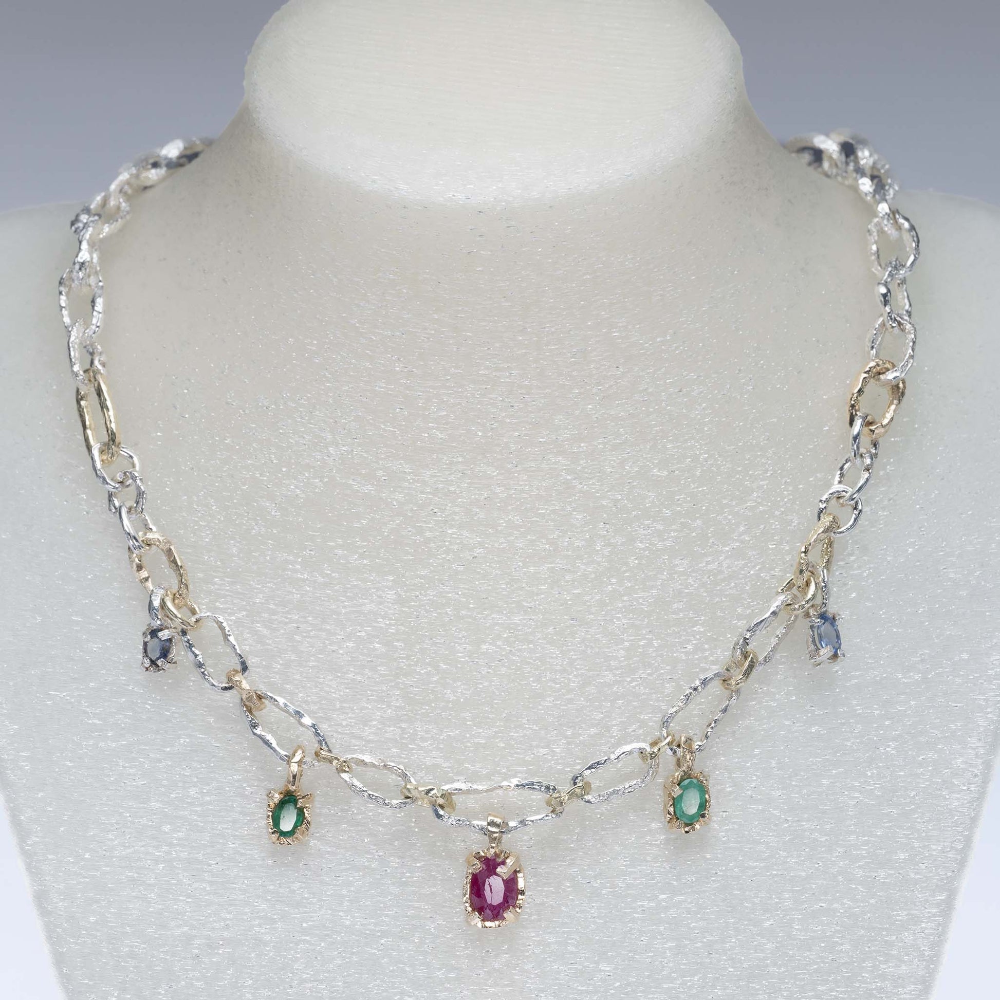 The necklace also includes two gold settings with natural emeralds of approximately 1 carat, and two blue sapphires of approximately 1 carat. An additional sapphire is set into the locking mechanism.